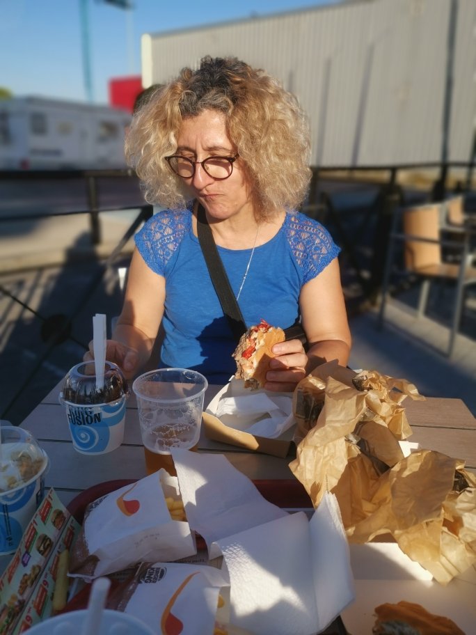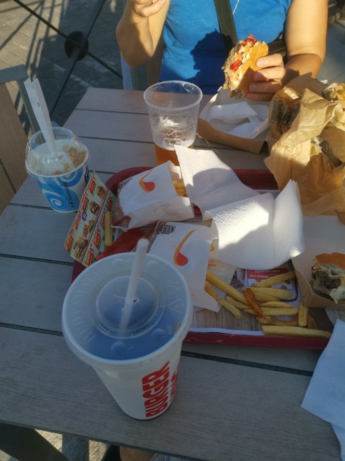 Après avoir posé le camping car dans le troupeau des autres CC et comme le frigo est vide, direction le Burger King..